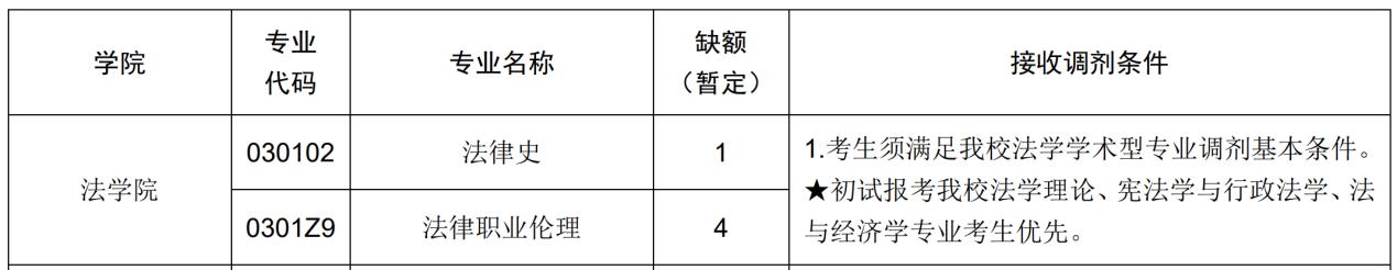 2.法学学术型各专业接收调剂申请截止时间统一为4月6日17:00。申请我校法学学术型各专业调剂的考生,只能填报一个学院的一个专业、研究方向,若同时填报多个志愿,将以考生在调剂系统最后一次填报的志愿为准。