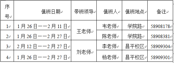 放假期间,两校区的日常值班及夜间值班由校总值班室负责,如遇紧急情况,由值班人员请示相关领导后处理。昌平校区值班电话:58909168、58909159(传真),学院路校区值班电话: 58908110、58908104(传真)。