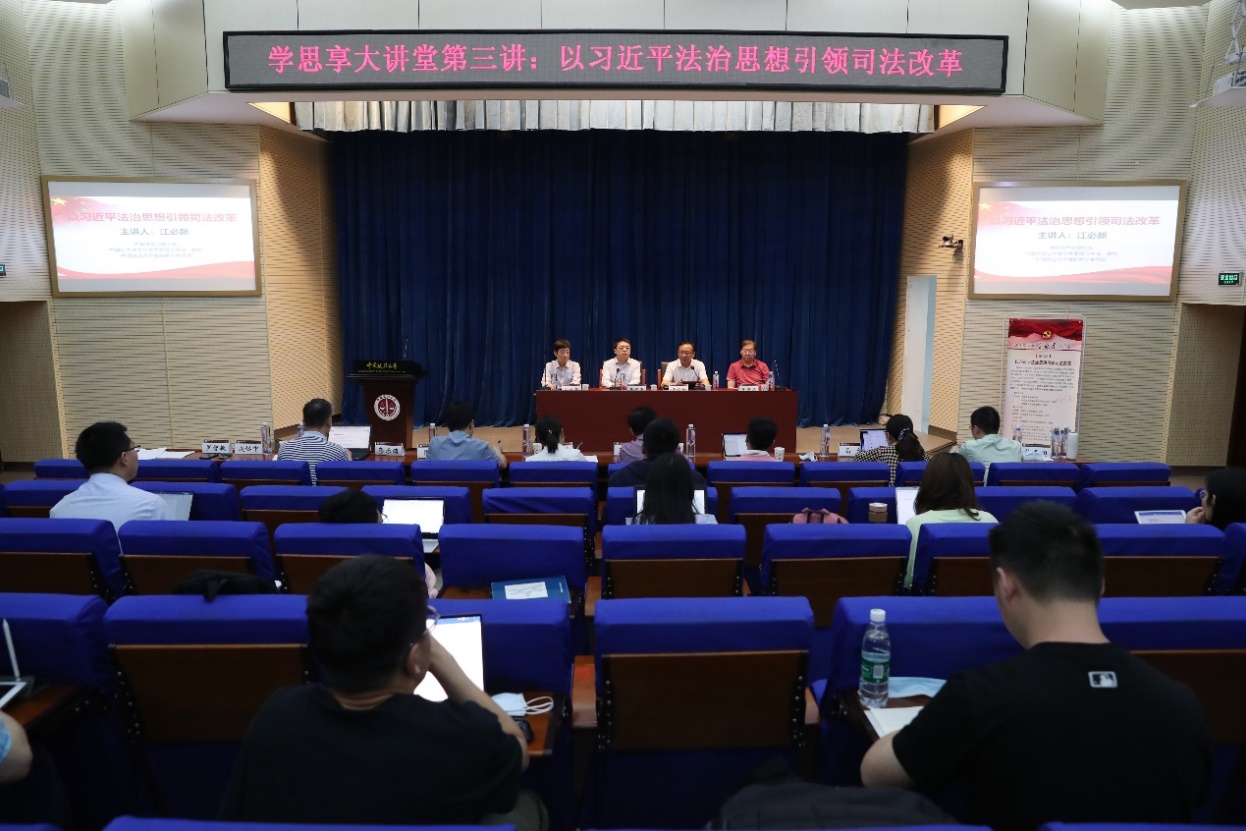 6月1日,beat365中国官方网站党委、beat365中国官方网站行政法研究所、行政法研究所党支部主办的“学思享”大讲堂第三讲在学院路校区综合科研楼学术讲堂开讲,第十三届全国人民代表大会宪法和法律委员会副主任委员、中国法学会副会长、我校博士生导师江必新教授专题讲授了“以习近平法治思想引领司法改革”。beat365中国官方网站院长焦洪昌、行政法研究所所长罗智敏与谈,beat365中国官方网站党委书记刘大炜主持讲座,行政法研究所教师及全校六百多名师生通过线上、线下相结合的方式参加了此次讲座。