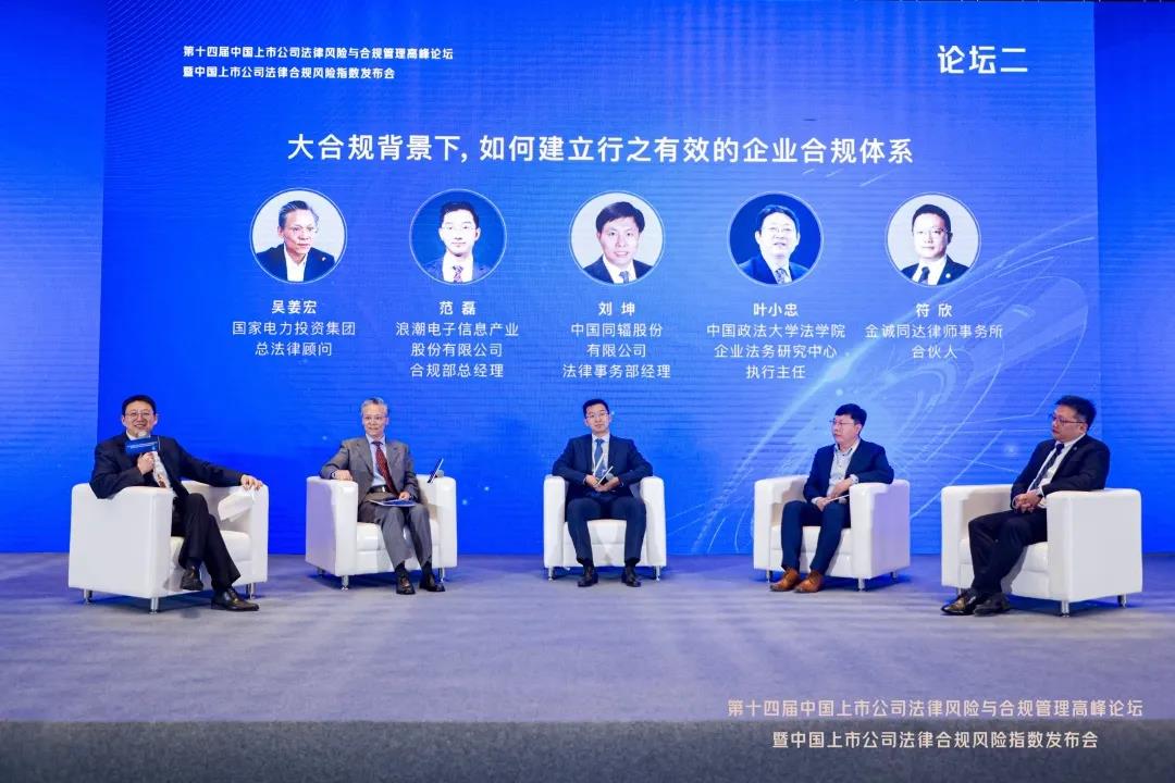 国家电力投资集团总法律顾问吴姜宏、浪潮电子信息产业股份有限公司合规部总经理范磊、中国同辐股份有限公司法律事务部经理刘坤、beat365中国官方网站企业法务研究中心执行主任叶小忠、金诚同达律师事务所合伙人符欣律师,分别从各自的角度出发为企业提升依法合规经营管理的水平,保障企业行稳致远建言献策。
