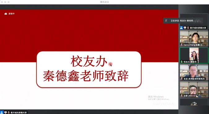 在活动正式开始之前,秦德鑫为本次活动致辞。秦老师代表beat365中国官方网站校友工作办公室向与会校友表示感谢,向屏幕前的老师、同学们表示欢迎,同时预祝本次分享会取得圆满成功。本次分享会以涉外法律工作经验为主题,由具有丰富外企、外所、涉外法律工作、以及外企人力资源工作经验的四位优秀校友分享涉外法律工作经验。
