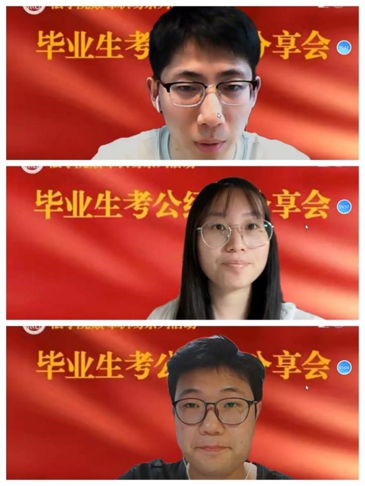 闫珊珊同学先介绍了自己参加国家公务员、北京公务员、北京选调生考试的情况,然后从岗位选择、时间线、行测、申论四个方面介绍了自己的备考经验,并建议大家要尽早开始、吃透真题、科学选岗。遆双达同学介绍了北京公务员考试的报名流程、岗位表、考题内容、体检考察等情况,并建议大家报名时要考虑岗位的报名情况,不要盲目。高子涵同学介绍了自己参加北京市选调生、国家公务员、浙江省选调生的情况,建议大家要提前写论文、多练习面试、有良好心态,做好多手准备。