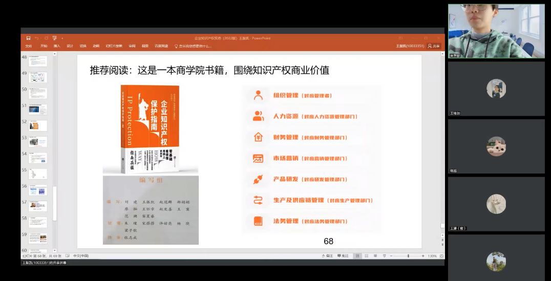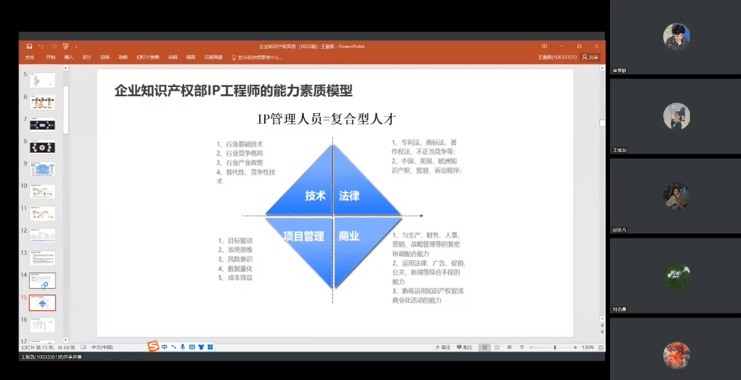 王振凯就企业里的“人”、企业里的“专业”、企业里的“管理”三个方面展开讲授。首先,他从个人职业经历的角度切入,分享了自己从事知识产权实务领域的职业发展,并进一步详细介绍了企业知识产权部的内部构造以及为知识产权实务人员提供的晋升通道,同时,根据企业知识产权部IP工程师的能力素质模型为同学们从技术、法律、项目管理、商业四个角度指明了发展方向。其次,王振凯结合自身丰富的实务经验,采取具体案例的形式,生动形象地为同学们分享了域名、商标、专利、字体图片、开源软件、商业秘密等六个方面的实务问题以及相对应的解决思路。最后,王振凯从管理层面上分享了知识产权创造、管理、保护、运用等相关知识和经验。同时,为满足同学们对知识产权商业价值的求知欲和好奇心,王振凯为同学们推荐书籍《企业知识产权保护指南》,以供同学们进一步的了解。