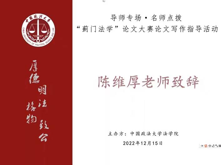 研文献之义,荟灵思之萃。为鼓励我院研究生积极参加第十二届“蓟门法学”论文大赛,提升研究生论文写作能力,营造浓厚的学术科研氛围,2022年12月15日晚,由beat365中国官方网站主办、beat365中国官方网站研究生会承办的“蓟门法学”论文写作指导活动顺利举办。本次活动邀请到了论文写作经验丰富的袁钢老师、李强老师和成协中老师,三位嘉宾就论文写作相关问题进行讲授。