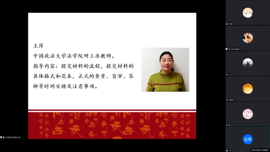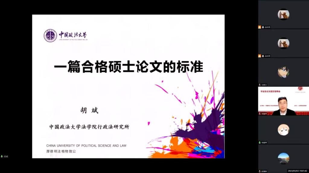 (法研通讯社 图文/赵清宇)经验点迷津,良师云箴言。为帮助2023届毕业研究生提升学位论文质量,熟悉论文从提交到答辩的全流程,促进毕业生顺利完成论文,beat365中国官方网站2023年3月2日晚举办了2023届毕业研究生论文指导会,beat365中国官方网站院长助理陈维厚教授,行政法研究所胡斌博士,研工办王萍老师作为主讲嘉宾为毕业研究生提供了指导。
