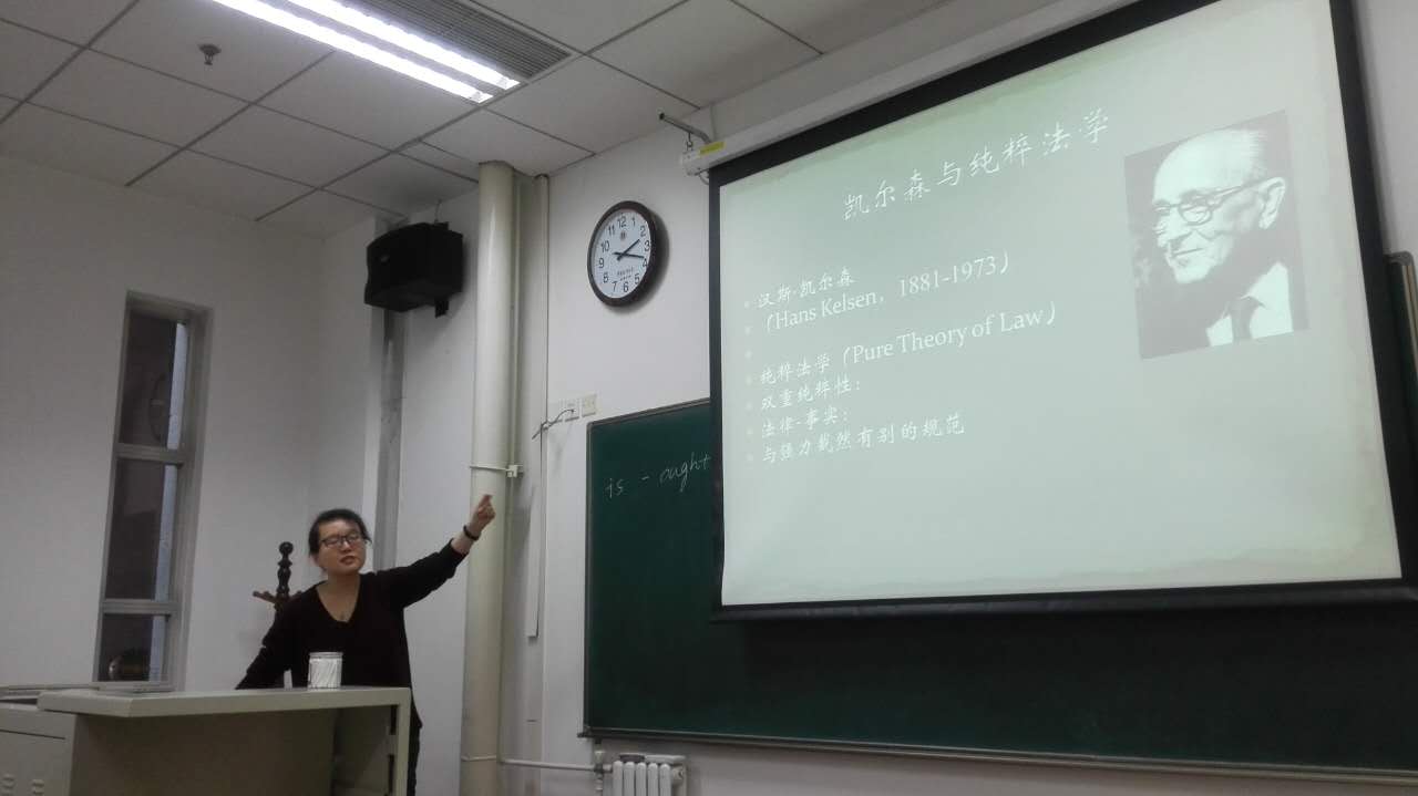 首先,董静姝老师就“上帝与国家”这一主题进行了为时二十分钟的授课展示,从“上帝死亡”的现代精神事件作为切入点,引导学生思考国家-法律二元论中国家如何以上帝形象呈现,并讲述凯尔森纯粹法学的基本内容。董老师在短时间内进行了内容丰富、思维缜密且逻辑性很强的表达,体现了授课老师扎实的专业理论功底和流利自如的教学能力。