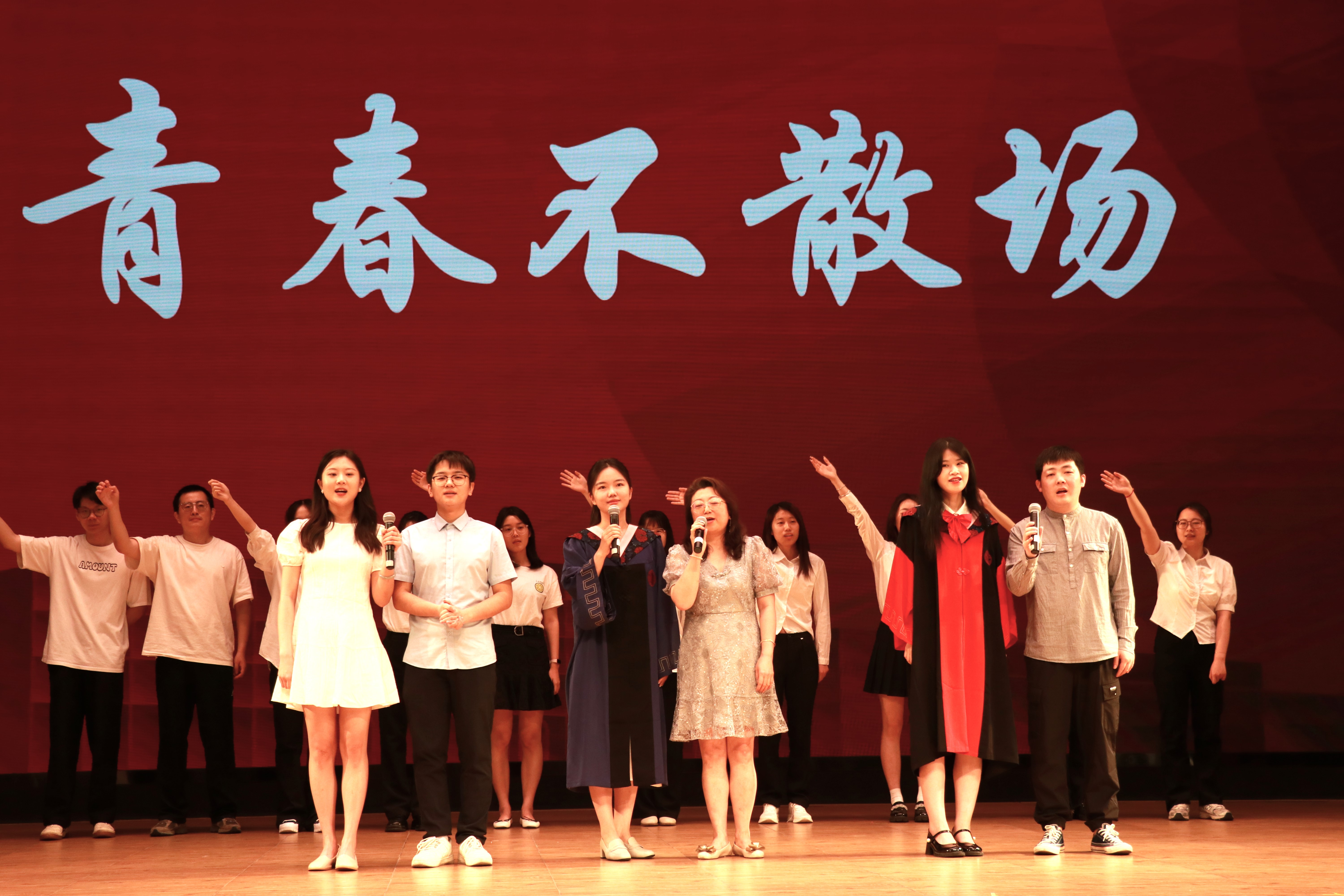 在郭虹领衔演唱的《送别》中,毕业典礼落下帷幕。毕业生与老师、同学合影留念,将彼此温暖的祝福定格在一张张照片中。山海有相逢,愿我们顶峰再见。
