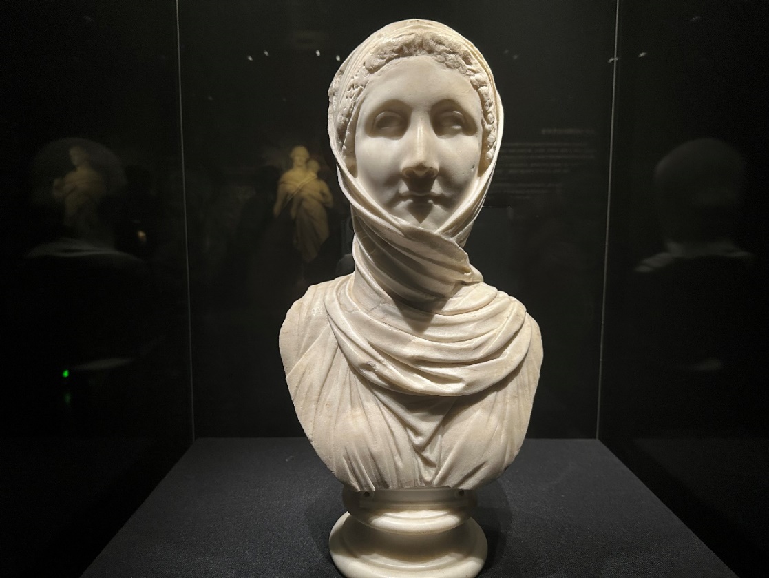 进入第二展厅,这里呈现了数件来自意大利的彩色壁画,生动描绘了庞贝古城人民戴上面具表演戏剧的娱乐场景。借助展厅内陈列的罗马帝国公主的头像,观展者可以窥见罗马统治阶层的奢华生活。在展厅的另一侧,陈列着许多展现平民日常生活的实用器皿,例如铜制灯具、陶罐、玻璃容器、化妆盒等。此外,展厅通过设置半圆剧场、电子屏幕、投影等方式播放罗马帝国的资料片,使观众拥有更加沉浸式的观展体验。