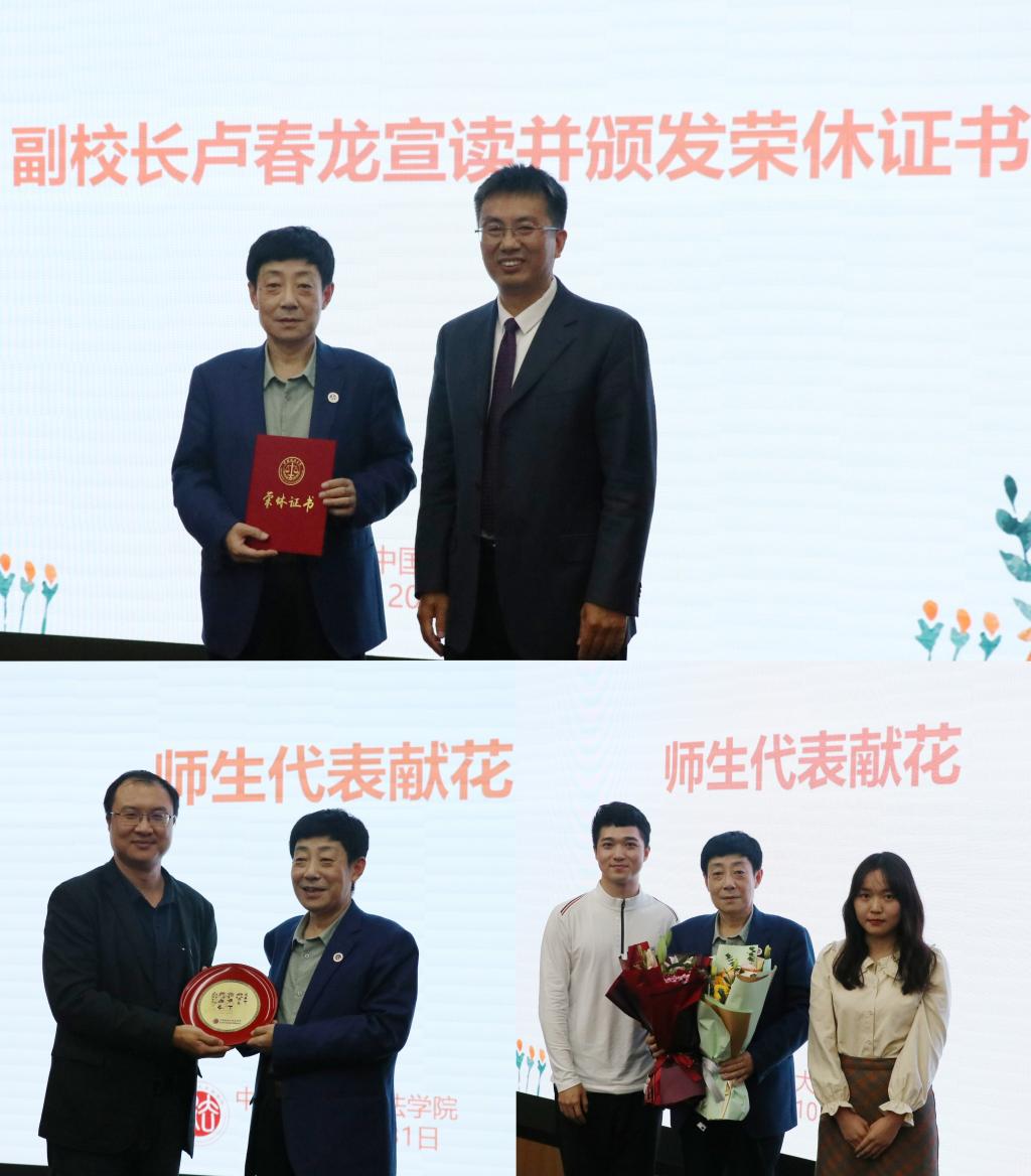 卢春龙为刘大炜书记宣读并颁发荣休证书,师生代表献上鲜花和礼物。