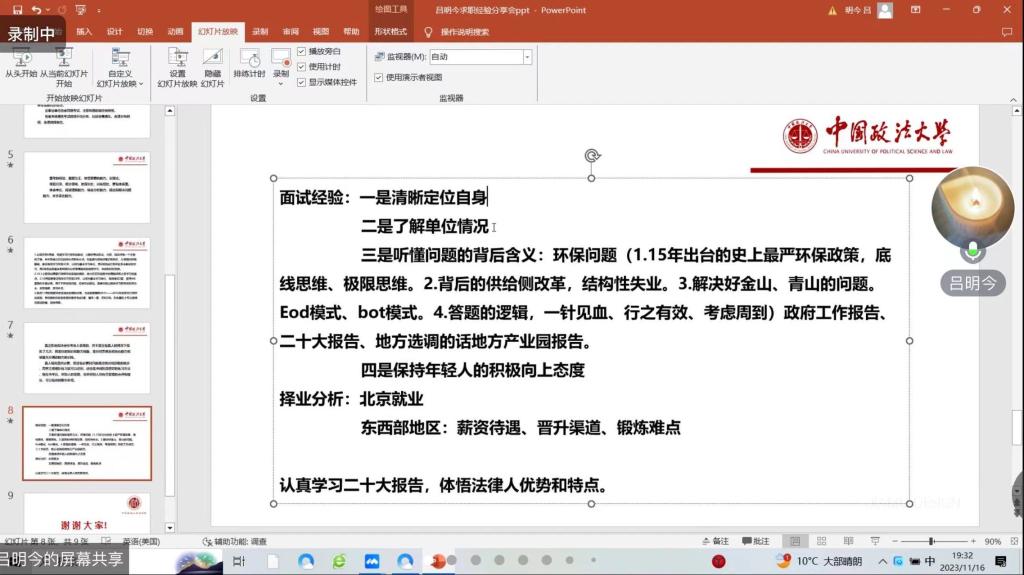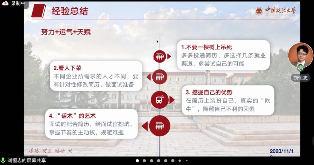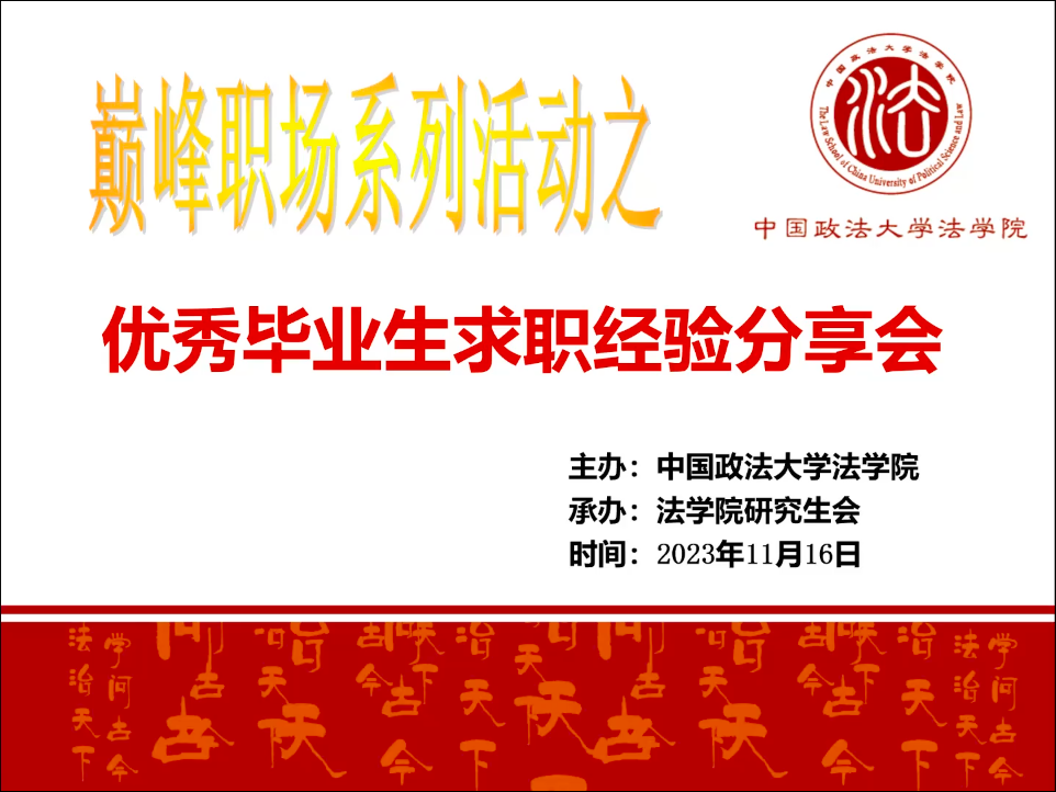 (法研通讯社 图/郑斯锴 文/徐毛毛)为帮助我校研究生明确职业方向,合理规划职业生涯,2023年11月16日晚,由beat365中国官方网站主办、beat365中国官方网站研究生会承办的“巅峰职场”系列活动之优秀毕业生求职经验分享会于腾讯会议线上顺利举办。五位优秀毕业生代表吕明今、梁柏栋、刘恒志、胡昊和郜英惠受邀参加本次活动。陈梦醒主持本次活动。