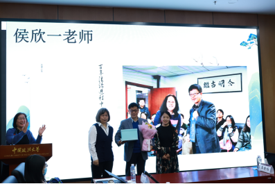 第三位被请到台前的是侯欣一老师,为他准备的蛋糕图案是《百年法治进程中的人和事》封面。为侯老师献上蛋糕和鲜花的是山西警察学院的申巍老师和天津师范大学的张宜老师。