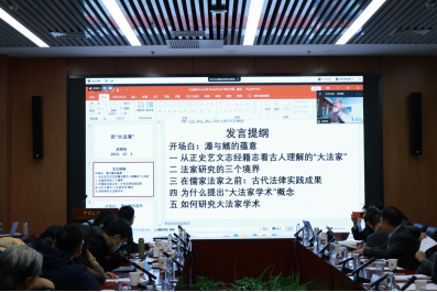 第一环节由中国社会科学院法学研究所研究员高汉成老师主持,西北大学特聘教授、中国法律思想史专业委员会会长武树臣老师为大家作了题为《论“大法家”》的发言。