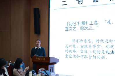 首先,陈煜老师明确了“礼法”的概念,即礼仪法度的统称。在此背景之下,陈煜老师依次讲解了题目中“时”“顺”“体”“宜”“称”五个汉字的具体意涵,随后以乡饮和乡射为例具体说明。乡饮和乡射是两种中国古代的“礼”,传说中的乡饮酒礼有四种形式,而乡射,则是每年春秋两季,各乡的行政长官以主人的身份邀请当地的卿、大夫、士和学子,在州立学校中举行的一种活动。乡饮酒和乡射礼的核心在于“敬”和“谦”,使人养成守礼的习惯。总结研究中国古代礼法的意义,陈老师认为在于培育社会资本、提升人与人之间的信任,推动公序良俗以及塑造公民共同体意识。