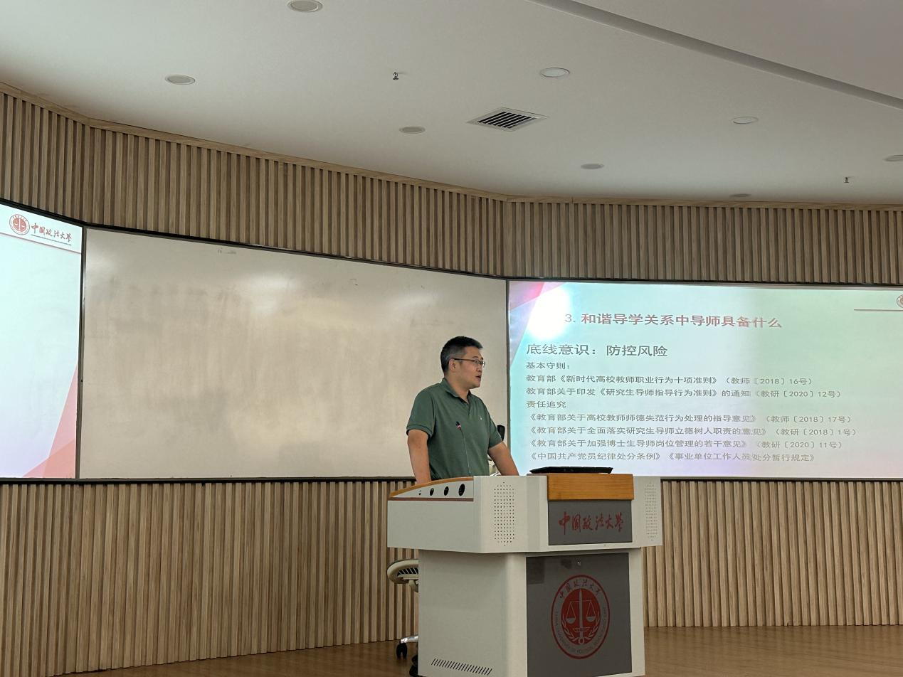 校研究生工作办公室主任兼研究生院副院长张永然教授围绕如何构建和谐导学关系这一问题进行了分享与交流。他提出,要构建新时代研究生教育的和谐导学关系,核心在于“导师怎么导,学生怎么学”。导师应当具备底线意识、法治意识、全员育人意识以及科学育人意识四种意识,掌握与学生交往沟通的能力、协调资源能力以及自我调节能力三种能力。