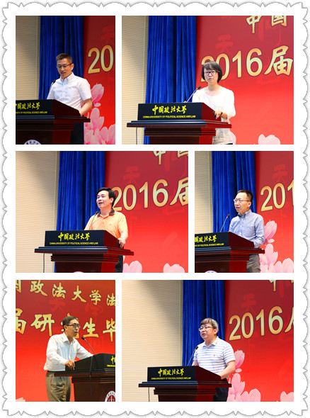北京天池君泰律师事务所高级合伙人殷杰作为校友代表致辞,送给毕业生一句诗“生活就像大海,大海要吞噬我,而我要拥抱它”,当前中国社会各个领域问题层出不穷,面对矛盾与纷争,要直面挑战、拥抱生活,铭记校训“厚德、明法、格物、致公”,修身养性,提升职业水平,用法律解决现实问题,关心国家前途命运、承担社会责任。最后,他祝福大家“乘风破浪会有时,直挂云帆济沧海”。