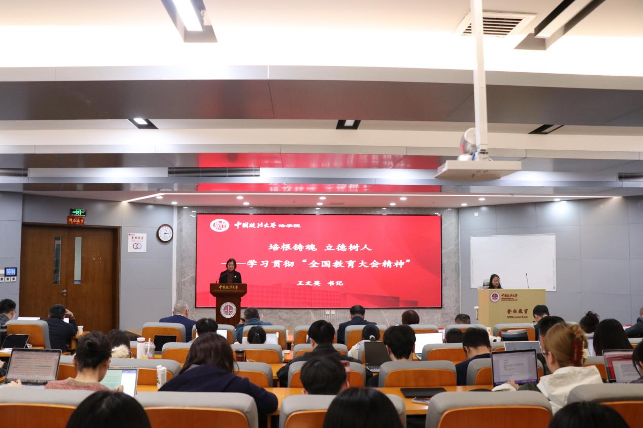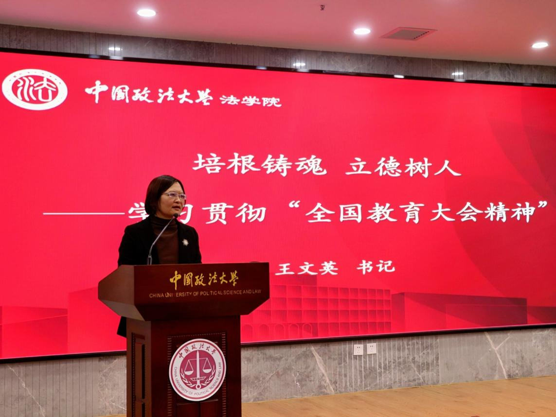王文英强调了全国教育大会精神的重要地位、主旨要义和实践要求。教育是强国建设、民族复兴之基,要牢牢把握教育的属性,深入了解全国教育大会精神的主旨要义,全面推进教育强国建设的战略任务和重大举措,坚定不移地落实好立德树人根本任务。对于如何贯彻落实全国教育大会精神、更好服务于立德树人根本任务,她提出四点看法:第一,强化思想引领。高校要坚持以马克思主义法学思想和中国特色社会主义法治理论为指导,始终坚守为党育人、为国育才的根本立场。学生骨干要不断提高自身政治站位,通过组织党团日活动教育引导同学们不断坚定理想信念。第二,创新育人平台。育人平台应从倾听、关注和理解的角度感知学生发展需求,做好工作方式方法创新和体制机制创新,加强党建、团建、班建和学生组织一体化建设。第三,优化组织机制。党支部、团支部、班委、学生组织社团应当发挥好各自的功能,做好队伍建设,通过考核评价与激励奖惩机制激发学生骨干积极性、主动性和创造性,促使其在各方面起到引领示范作用。第四,发挥骨干作用。学生干部是学院育人工作的重要参与者和得力的助手,要发挥好桥梁纽带作用,在学生中营造积极向上的氛围。