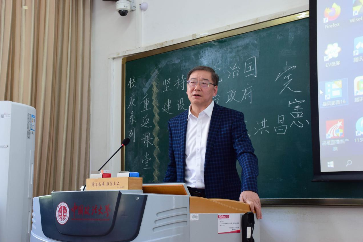 主讲环节,焦洪昌就“依法治国,依宪治国”主题展开分享。首先,焦洪昌回忆了自己40余年留校任教的经历。从宪法教研员到助教生讲师,再到临危受命破格录取任教,他强调了讲台对一位老师的重要性,表示始终想“站在本科生的讲台”。