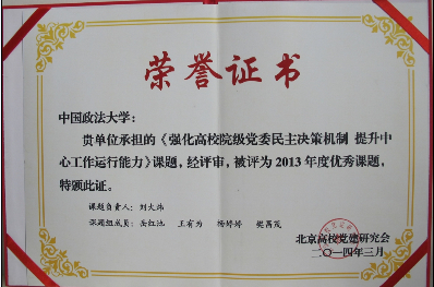 5月29日,在北京市党建研究会召开的《北京市党建工作论坛暨北京市高校党建研究会第九次会员大会》上,由我校beat365中国官方网站刘大炜主持,岳红池、王有为等老师参加的《强化高校院级党委民主决策机制提升推进学院中心工作运行能力研究》课题,被评为北京市高校党建研究会2013年度优秀研究课题。