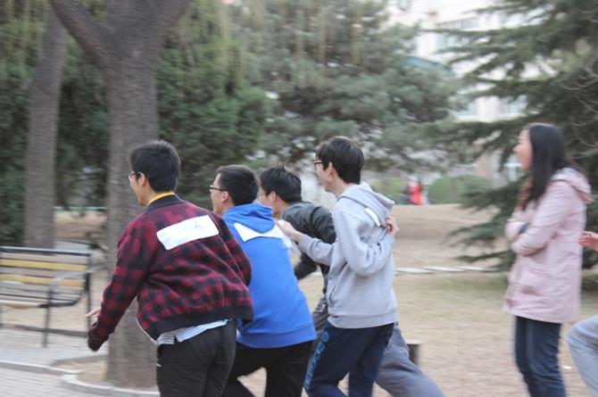 伴随着一声“开始”,两组队员迅速分散到广场的各个角落。比赛一开始呈现出势均力敌的状况,两队采取不同的战略战术。A组成员选择多人联合共同行动,发现落单的B组成员以后奋起攻击围剿并迅速撕下名牌。通过这种方法,A组淘汰了不少对手。B组则较为分散,攻击力较弱的几名成员明智地选择暂时躲藏起来保存体力,攻击力较强的几名队员则选择正面对决的方式,通过灵活的闪躲,迅猛的出手亦淘汰了A组的不少成员。比赛进入白热化阶段,两组成员聚集在广场的中心地区,A组人数占明显优势,经过几次一对一的PK试探,A组发动总体进攻,B组人员全军覆灭,A组取胜。有趣的是,在比赛全部结束以后,B组一名隐藏了很久的成员终于现身,遭到众人围攻。撕名牌结束后,参赛队员到后勤处领取慰问品。