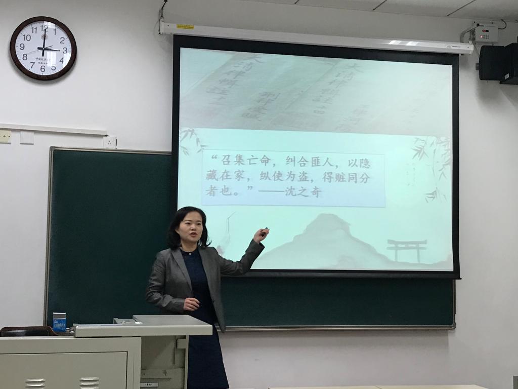 然后,谢晶老师以“盗贼窝主”这一主题做了授课展示。谢晶老师借助模块清晰、图文并茂的PPT向在座的老师们介绍了“盗贼窝主”的基本概念、流变、立法缘由及介绍了相关领域的一般和特别规则。谢晶老师的授课风格严谨而不失活泼,学术性与趣味性并重。