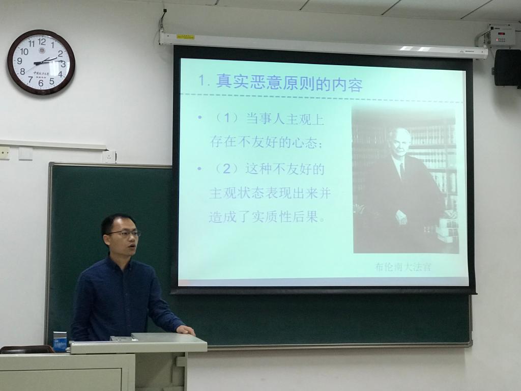 首先,李松锋老师以“批评性言论的尺度”为主题进行了为时近二十分钟的授课展示,从美国《纽约时报》诉沙利文案的事件作为切入点,引出真实恶意原则的起源,并展开阐述真实恶意原则在国外的扩张适用以及在国内司法中的适用等基本内容。李松锋老师在短时间内进行了思维缜密、逻辑性很强的表达,体现了授课老师扎实的专业理论功底和流利自如的教学能力。