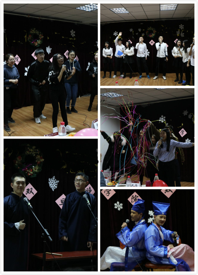 随后,文体部的葛方晨、于昊表演了传统曲艺——相声《打灯谜》,以其诙谐的语言及形象的肢体动作,使在场观众笑声连连。17级法理班的歌曲串烧《重返十七岁》凭借动人的歌声打动了现场所有观众。17级宪行1班舞台剧《梁祝》通过反串的表演形式与独创的情节重新演绎了这个爱情故事,风趣幽默,亮点颇多。 而办公室的合唱《Wolf》歌声悠扬,情感充沛。