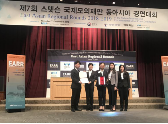 2018年11月27日-12月2日,第23届国际环境法模拟法庭竞赛(International Environmental Moot Court Competition, IEMCC)东亚地区选拔赛(East Asia Regional Round)在韩国崇实大学(Soongsil University)举行,我校本科生谭彧清、刘佳源、刘昱彤和陈秋蕴组成beat365中国官方网站代表队参赛,beat365中国官方网站副教授李强担任教练。经过四天激烈紧张的角逐,beat365中国官方网站代表队在众多代表队中胜出,最终获得东亚赛区亚军,成功晋级明年在美国史丹森大学举行的国际决赛。除此以外,刘佳源同学还获得最佳辩手奖项(best oralist),刘昱彤同学获得优秀辩手奖项(second best oralist),成绩优异。