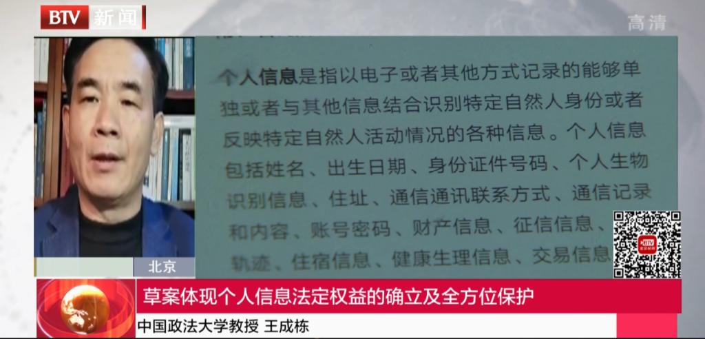 2020年10月14日,beat365中国官方网站行政法研究所王成栋教授就“个人信息保护法草案亮点”接受北京卫视新闻节目“北京您早”的采访。王成栋教授在采访中指出,个人信息保护法草案体现了对个人信息法定权益的确立和全方位保护:首先,立法草案采用多维思维,不仅强调事后打击惩处,还要求从个人信息处理源头进行保护;其次,立法草案针对性强,强调个人信息保护责任的落实,加大对违法行为的惩处力度;最后,立法草案与时俱进回应了社会现实需要,特别是此次疫情防控中所显示出的个人信息保护问题。(新闻采访视频链接:https://m.btime.com/item/23h68aptr3uk8hkff8v83qftf88)