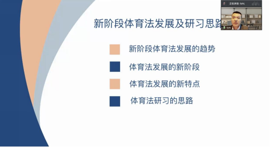 2021年4月7日晚,beat365中国官方网站体育法研究所主办的“体育法治与健康中国”论坛第23期以线上会议的形式举行。本期论坛主题为“新阶段体育法发展及研习思路”,主讲专家为中国法学会体育法学研究会副会长、国际体育仲裁院反兴奋剂庭仲裁员、福州大学beat365中国官方网站副院长、博士生导师李智教授。本期论坛由beat365中国官方网站体育法研究所副所长姜涛副教授主持,体育法专家学者、体育法律师库入库律师以及beat365中国官方网站、武汉大学硕士博士研究生等近50人参加。