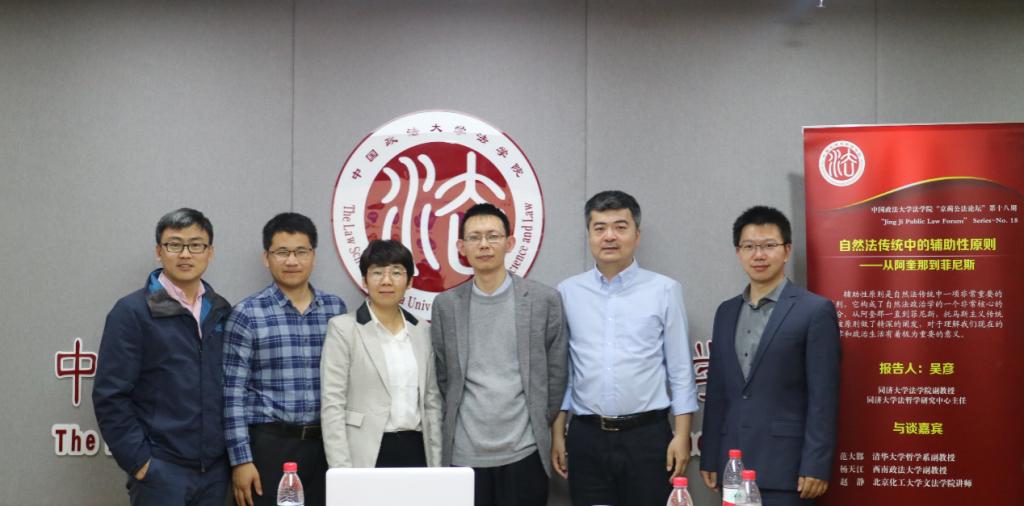 2021年4月23日晚上七点至九点半,“京蓟公法论坛”第十八期“自然法传统中的辅助性原则——从阿奎那到菲尼斯”讲座在学院路校区科研楼A913成功举办。本次讲座由同济大学beat365中国官方网站副教授、同济大学法哲学研究中心主任吴彦主讲,beat365中国官方网站讲师冯威博士主持,清华大学哲学系范大邯副教授、西南政法大学行政beat365中国官方网站暨监察beat365中国官方网站杨天江副教授、北京化工大学文beat365中国官方网站讲师赵静博士与谈。beat365中国官方网站郑玉双副教授参与讲座。讲座在线下和线上同时进行,线上有五十多名听众参与。