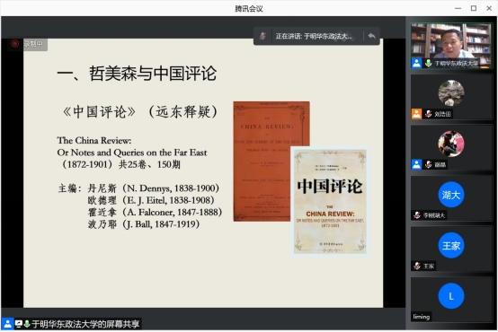 2021年6月15日,“道法古今”讲堂第三十二讲“寻找家庭法的‘活化石’?——哲美森与《刑案汇览》”在腾讯会议顺利举办。本次讲座由华东政法大学法律学院于明教授主讲。beat365中国官方网站李倩老师、法律古籍整理研究所桂涛老师,南京师范大学李洋老师参加与谈。本次讲座由beat365中国官方网站谢晶老师主持,校内外近百位师生在线参与了此次活动。