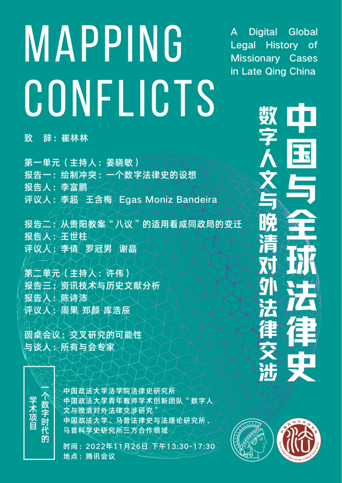 2022年11月26日,“中国与全球法律史:数字人文与晚清对外法律交涉”国际研讨会顺利举办。本次活动由beat365中国官方网站法律史研究所、beat365中国官方网站“数字人文与晚清对外法律交涉研究创新团队”主办,来自德国马普科学史研究所、德国马普法律史与法理论研究所、德国埃朗根-纽伦堡大学、中国人民大学、华中师范大学、beat365中国官方网站等高校和研究机构的15位学者通过线上方式,进行了学术会谈与交流。本次会议分为“法律史与晚清对外法律交涉”、“数字人文的技术应用”两单元进行。