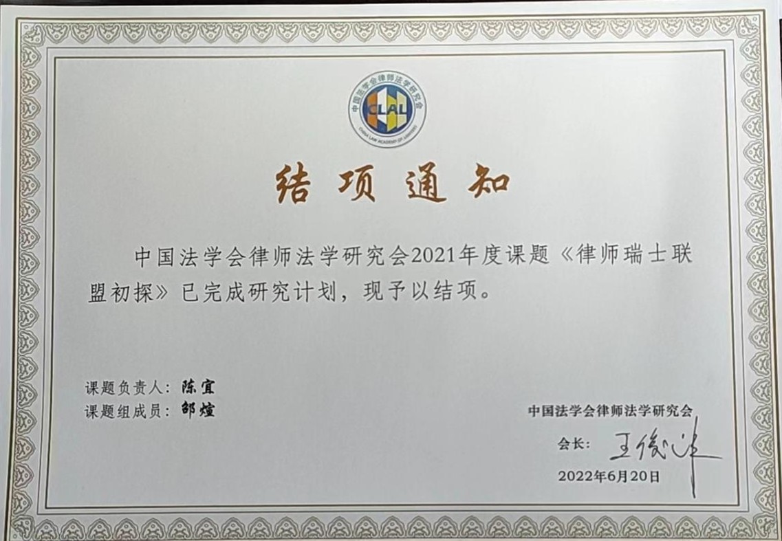 课题组成员陈宜教授、硕士生邵煊,通过座谈、调研等方式收集到许多一手资料,全面了解国内律师瑞士联盟现状,并通过文献分析、比较研究等深入讨论了律师瑞士联盟的职业伦理问题以及可行的规制方式,于2022年6月完成研究计划,成功结项。