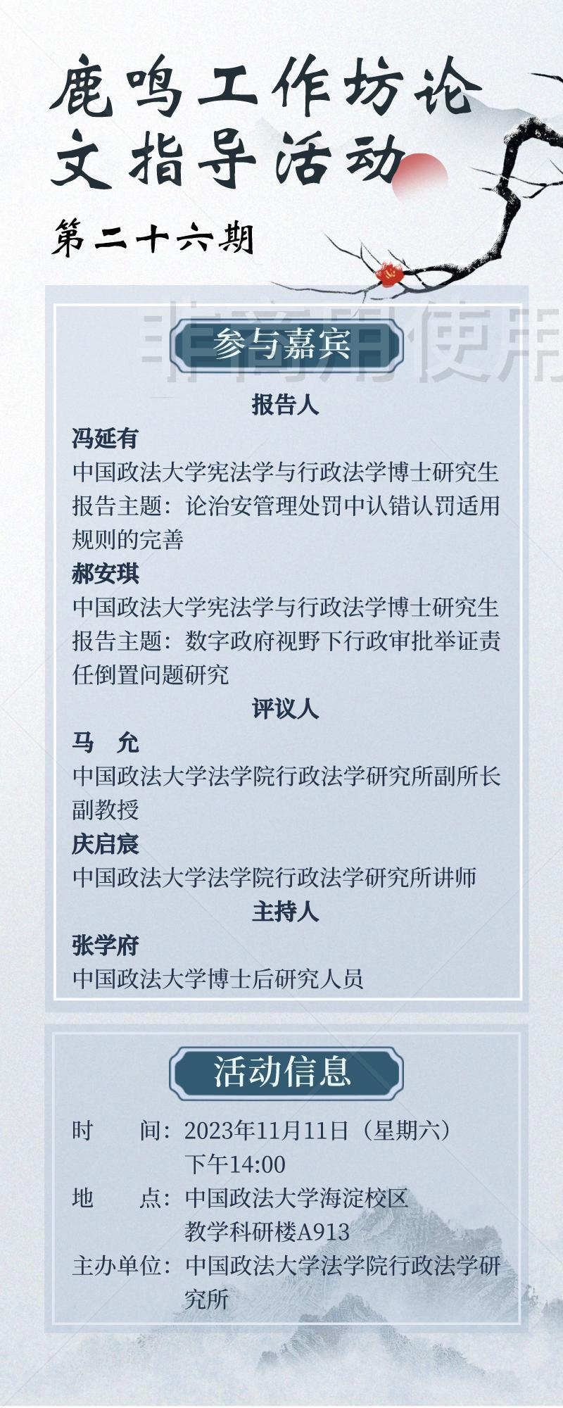 2023年11月11日,beat365中国官方网站第二十六期“鹿鸣工作坊”论文指导活动在研究生院科研楼A913会议室成功举办。本次活动由beat365中国官方网站行政法研究所举办,张学府博士后主持。本期活动的导引发言主题是“研究新生学术规划”,beat365中国官方网站马允副教授和庆启宸讲师作为指导教师参与了本次活动。本期有两位报告人,一位是宪法学与行政法学博士研究生冯延有,报告主题为《论治安管理处罚中认错认罚适用规则的完善》,评议人为谭琬莹和周玉琴。另一位是宪法学与行政法学博士研究生郝安琪,报告主题为《数字政府视野下行政审批举证责任倒置问题研究》,评议人为李晨和李诗勤。本期活动还有二十余名beat365中国官方网站博士及硕士参加。