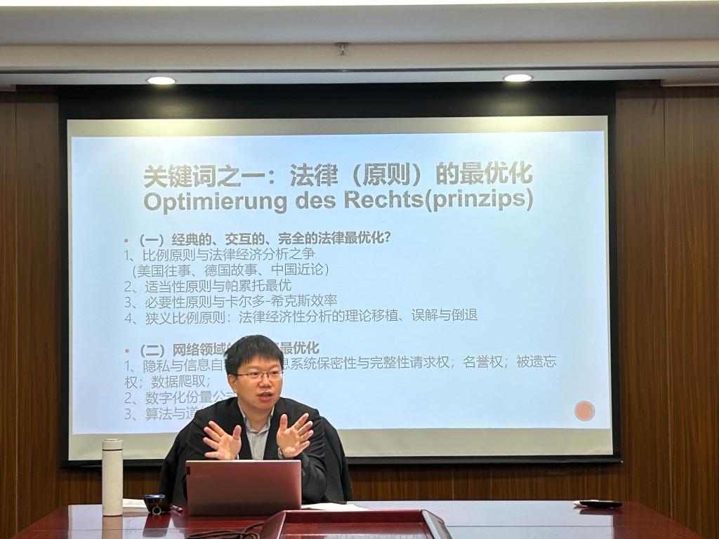 在研讨环节,雷磊老师就德国海外交流经历对于法学理论专业研究生的意义与德国法哲学的体系化构造能力与冯威老师展开了探讨。李倩老师就阿列克西宪法权利适用的比例原则进行了提问。张力老师、袁钢老师就德国博士生培养的具体要求、学术访问的可能性和对于我院法学人才培养的启示进行了交流。