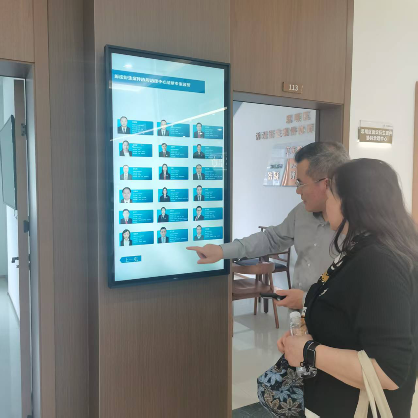 随后,团队在法院工作人员引导下,参观了解思明区法院的多元解纷工作体系。法院法官介绍,该体系以“双枢引领、三化赋能、四力支撑”为架构,推动诉调对接向纵深发展。“双枢引领”聚合多方资源,打造解纷合力;“三化赋能”涵盖诉讼辅导前置化、风险预警体系化、普法宣传融合化,多维度助力纠纷化解;“四力支撑”从“近邻”品牌力、“云上”生产力、调处“兑现力”、解纷“硬实力”着手,全方位保障解纷成效。自2020年6月中心成立以来,调处各类纠纷6.5万余件,成功扭转万人成讼率持续增长的趋势,2022年同比下降1.3%,成果显著。