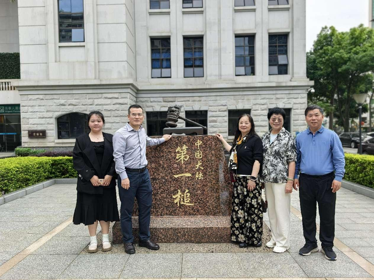 抵达思明区法院后,团队成员首先参观了具有特殊历史意义的 “中国大陆第一槌”,并一齐合影留念。2001年9月14日,思明区法院时任院长在审理刑事案件时敲响此槌。它由花梨木雕刻獬豸兽头,手柄有麦穗和齿轮雕饰。思明区法院敲响的“第一槌”,很快引起了最高人民法院的注意。2002年法槌在全国法院统一使用,“第一槌” 现藏于中国法院博物馆,它是我国审判形式改革的标志性见证,彰显着司法工作对公正与效率的追求。
