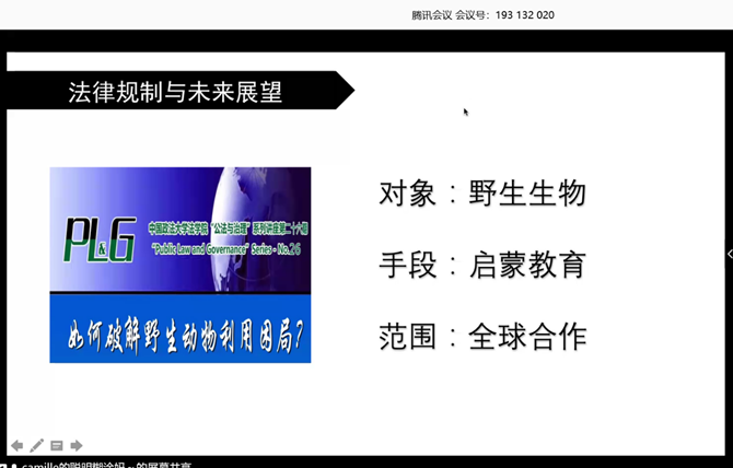孙娟娟博士从野生动物的食源视角、食品安全与公众健康、法律规制与未来展望三方面展开此次讲座。她指出野生动物成为人类食源的原因包括个人饮食偏好、地域习惯,以及满足自身生存需要等。食品安全规制包括安全推定和不安全推定两种规制路径,安全推定的样例包括《新食品原料安全性审查管理办法》第二条,不安全推定的依据则是现有科学研究。在科学确定性下,应当遵循预防原则,在科学不确定性下,遵循谨慎预防原则。目前《全国人民代表大会常务委员会关于全面禁止非法野生动物交易、革除滥食野生动物陋习、切实保障人民群众生命健康安全的决定》就是以科学对新型冠状病毒研究的不确定性为基础发布的,背后体现了谨慎预防原则。孙博士认为,全国人大常委会的决定在一定程度上对野生动物的利用下了“禁令”,但是在现有的法律框架下,《野生动物保护法》《国家重点保护野生动物驯养繁殖许可证管理办法》均保护对野生动物的合法性利用。在未来的野生动物立法方面,应当推进跨学科合作,使立法更具科学性;不断完善作为例外的“白名单”,同时平衡各方利益诉求,破解野生动物利用困局。
