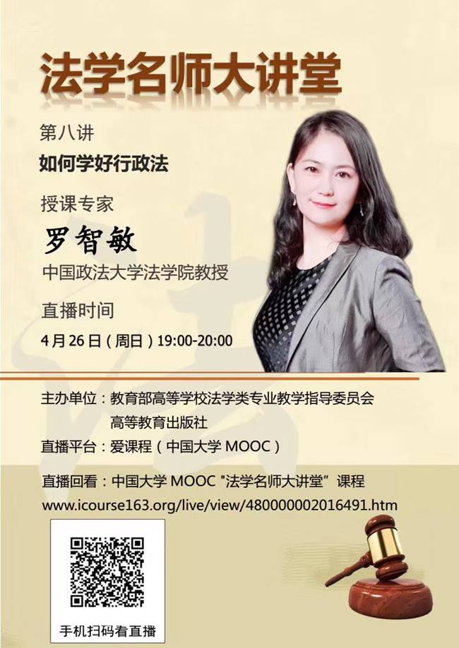 2020年4月26日晚19时,“法学名师大讲堂”系列讲座持续开播。本系列讲座由教育部高等学校法学类专业教学指导委员会与高等教育出版社联合举办,围绕法学专业十门专门必修课,特邀十位国内知名法学家,于4月12日-4月30日通过爱课程(中国大学MOOC)向全社会免费直播。本场“如何学好行政法”为系列讲座之八,特邀beat365中国官方网站行政法研究所所长罗智敏教授主讲。
