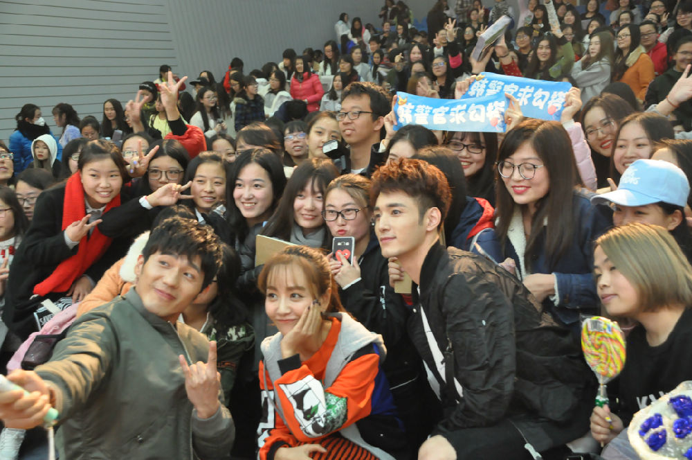 随着主持人的简短引入,灯光绽放,三位嘉宾闪亮登场,全场骤然沸腾!掌声,欢呼声,尖叫声,偶像们登台那一刻,粉丝们的热情瞬间引爆会场,他们纷纷挥舞双臂,满溢的激情感染着在场的每一个人!杨蓉、白宇、何奉天依次和大家问好,幽默而亲切的问候再度点燃了同学们一波又一波的欢呼,在短暂的平复过后,粉丝们和偶像一起欣赏了《美人为馅》的宣传视频。