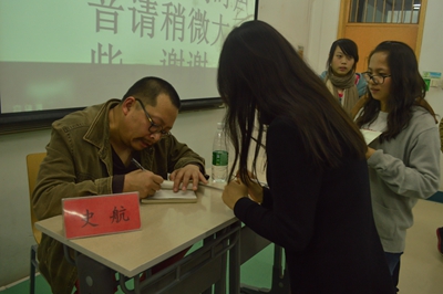最后进行的纸条答疑和现场提问环节将现场氛围推向高潮,现场同学积极踊跃的提问,史航老师则针对同学们提出的问题进行了细致而深入的解答。活动最后,他还慷慨地送出自己珍藏的二十余本亲笔签名的人物传记,并与同学们合影留念。