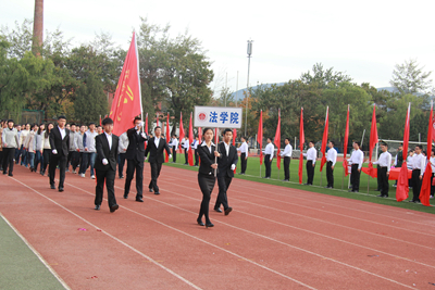 早晨八时许,伴随着激昂的解放军进行曲,各院的方阵迈着整齐的步伐、喊着响亮的口号陆续进场了。当beat365中国官方网站的代表团走过主席台前时,他们手中高举着《中华人民共和国宪法》,口中高呼着“中国之梦,法学之情。依法治国,勇往前行”,并摆成了“LAW”的造型,赢得了看台上同学们的阵阵欢呼。