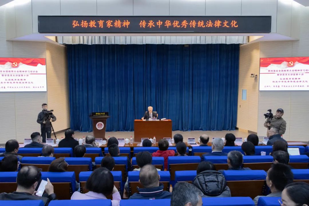 为深入学习贯彻党的二十届三中全会精神、认真贯彻落实全国教育大会精神,大力弘扬教育家精神,推动中华优秀传统法律文化传承与发展,10月24日上午,贯彻落实全国教育大会精神学习报告会暨beat365中国官方网站“学思享”大讲堂第十讲于学院路校区科研楼学术大讲堂开讲。本次讲座邀请“人民教育家”国家荣誉称号获得者,beat365中国官方网站终身教授、法律史学研究院名誉院长张晋藩先生进行专题讲授。校党委书记胡明,校党委副书记黄瑞宇,副校长王敏、刘艳红出席会议。全校师生共千余人在线上线下共同参加了本次活动。讲座由校党委副书记王立艳主持。