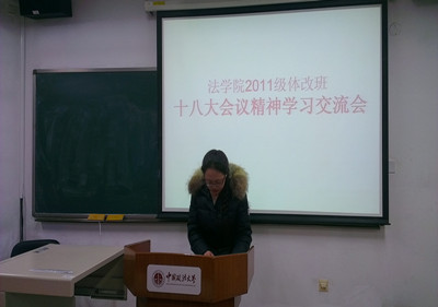 首先党支部书记张馥结合体改班的情况,就党的十八大报告关于法治的内容分享了学习心得。他说,党的十八大全面总结了我国的法治建设,提出全面推进依法治国,要推进科学立法、严格执法、公正司法、全民守法,坚持法律面前人人平等,保证有法必依、执法必严、违法必究的法治理念。作为将要踏入政法系统的在校大学生,每个人都要做到学法、懂法、知法、用法,在以后的工作中践行法治精神。