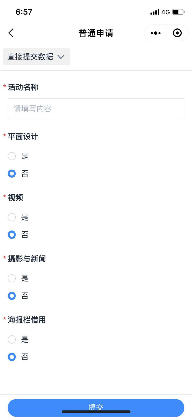 如果是申请“平面设计”“新闻与摄影”“视频”“海报栏借用”等工作,请点击“普通申请”,填写表单并提交申请。