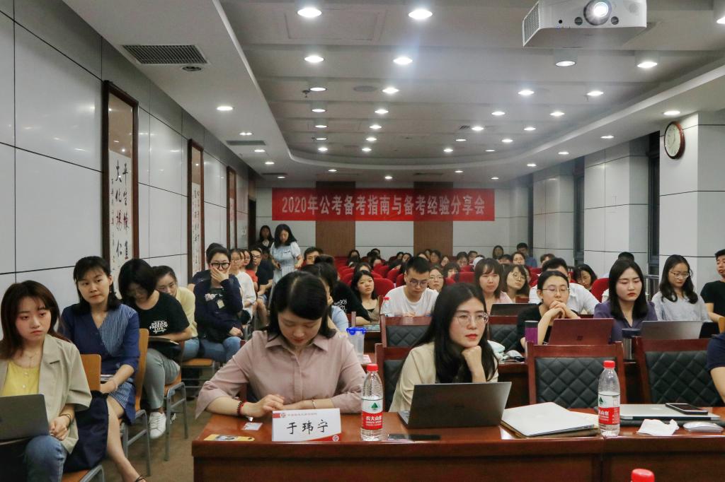 (法研通讯社 文/安香玉 图/蒲翠月)为了帮助同学们加强对公务员考试的了解,传承有益经验,促进就业率和就业质量双提升,5月23日晚,beat365中国官方网站研究生工作办公室在我校学院路校区科研楼B211举办了2020年公考备考指南与备考经验分享会。中公教育赵娇娇以及2019年公考学生代表谈文栋、郭林雄、于玮宁出席了本次活动。