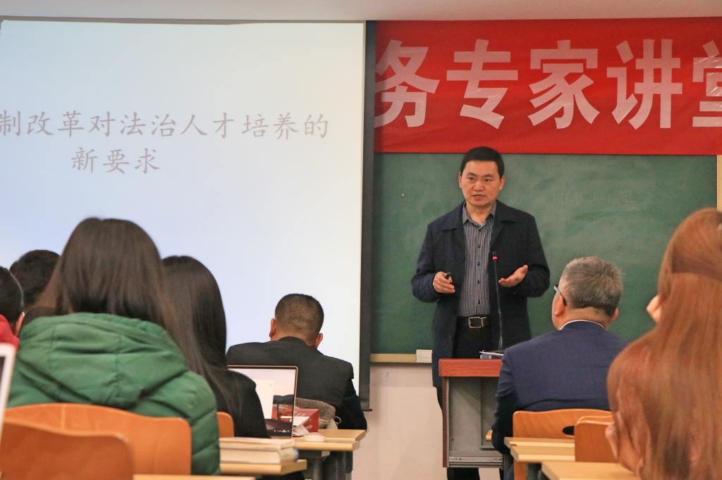 (法研通讯社 图/文 朱颖超)为了贯彻落实习近平总书记考察法大时5.3重要讲话精神,将优质实践教学资源引进高校,培养高质量“职业化、应用型”卓越法律人才,beat365中国官方网站于11月8日在我校学院路校区举办了实务专家讲堂,邀请了江苏睢宁法院党组书记、院长袁长伟担任主讲人,主题是《司法体制改革对法治人才培养的新要求》,beat365中国官方网站研工办主任陈维厚副教授主持讲堂。