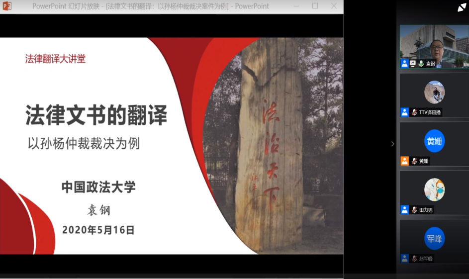 为了促进疫情期间在线法律翻译学习,增强法律翻译者实战经验,加强高校法律翻译人才培养,助力国家涉外法治人才队伍建设,中国翻译协会法律翻译委员会与全国翻译专业学位研究生教育指导委员会联合推出“法律翻译大讲堂”系列在线讲座,向全社会免费直播。2020年5月16日,beat365中国官方网站袁钢教授应“法律翻译大讲堂”邀请担任主讲专家,介绍涉外法治人才培养的背景,重点讲解法律文书翻译中育法特点、句法特点和专用术语;从个人和团队两个方面来介绍做好法律文书翻译的准备;以孙杨仲裁裁决为例,分析法律文书的翻译中四个原则,即遵循原文条纹、遵照法律表达、遵从惯习和官方文件、遵奉质量至上。约500人在线观看,讲座结束后袁钢教授也回答了在线观众的提问,重点回答如何做好法律翻译人才培养问题。袁钢教授也在线分享了孙杨仲裁裁决案件的中文版(http:/info/1609/10016.htm)。获取该次讲座课件和视频资料可以访问以下地址:https://ttv.cn/archives/9793。