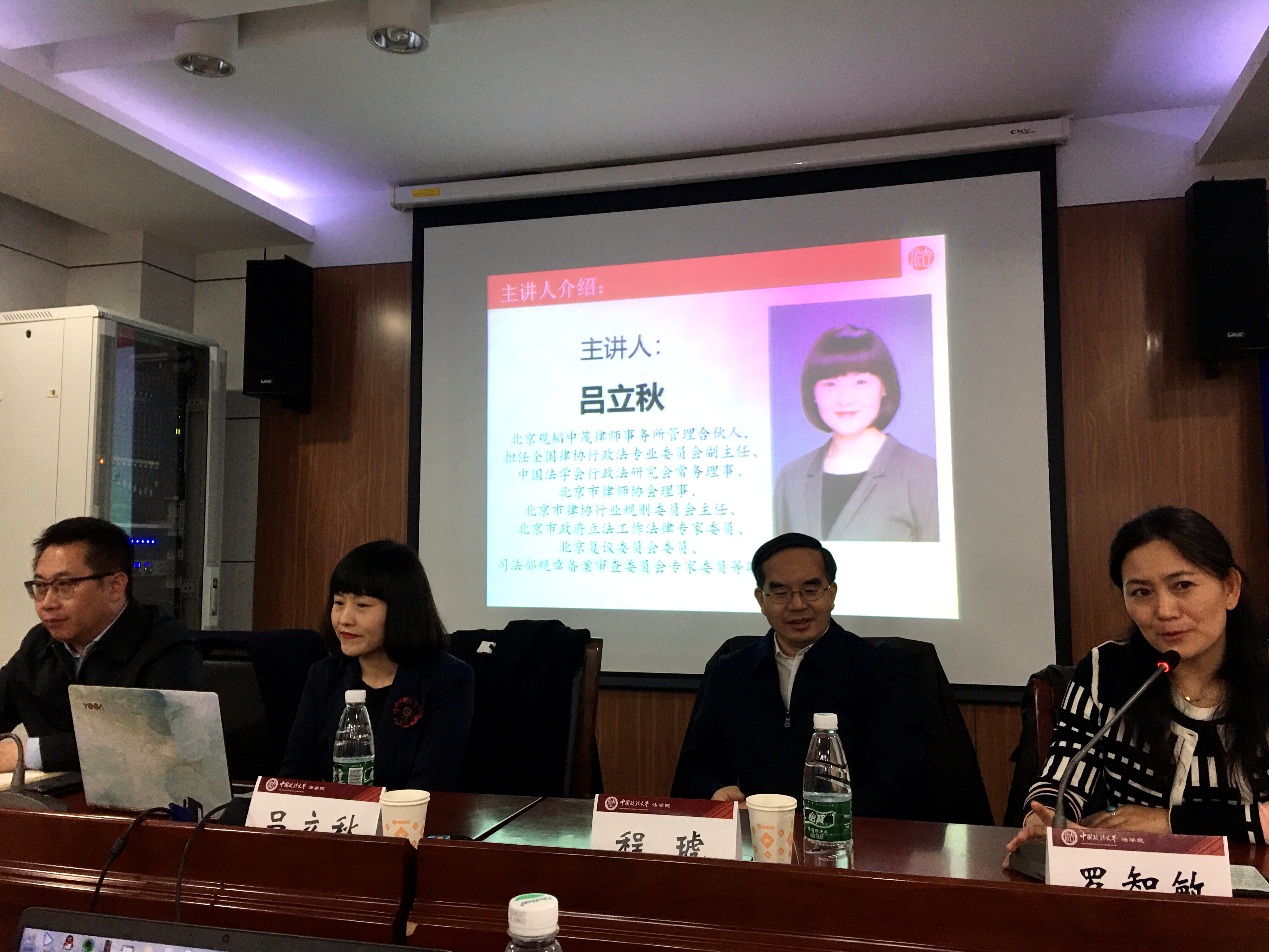 2020年11月24日晚7点,beat365中国官方网站行政法研究所在科研楼B211会议室成功举办了“行政法实务大讲堂”第一期,主讲人吕立秋律师以“行政诉讼实务问题与思考”为题开展了专题报告。本次讲座由行政法研究所所长罗智敏教授主持,北京市第四中级人民法院副院长程琥、司法部行政复议与应诉局综合处处长徐运凯参加与谈,beat365中国官方网站法治政府研究院曹鎏副教授、beat365中国官方网站行政法研究所马允副教授、张冬阳博士、胡斌博士等参加讲座,beat365中国官方网站的学生们也踊跃参加了此次论坛。