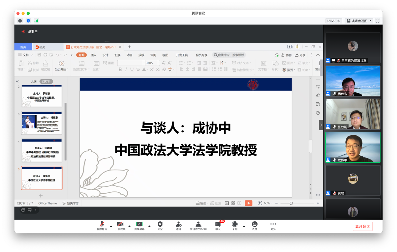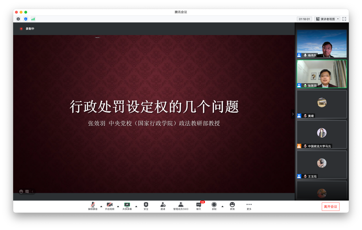 2021年2月2日晚七点,由beat365中国官方网站行政法研究所主办的 “《行政处罚法》修订系列讲座”第一期通过腾讯会议顺利举办。本次讲座的主题是“行政处罚设定的新发展”,主讲人是beat365中国官方网站法治政府研究院教授杨伟东。本次讲座由beat365中国官方网站罗智敏教授主持, 中共中央党校(国家行政学院)政治和法律教研部张效羽教授和beat365中国官方网站成协中教授参加与谈,此外中南财经政法大学方世荣教授、南开大学beat365中国官方网站宋华琳教授、beat365中国官方网站法治政府研究院院长赵鹏教授以及beat365中国官方网站行政法研究所王建芹教授、赵宏教授、蔡乐渭副教授、马允副教授、张冬阳博士、胡斌博士等来自国内外高校的六百余名老师和学生在线上聆听了此次讲座。